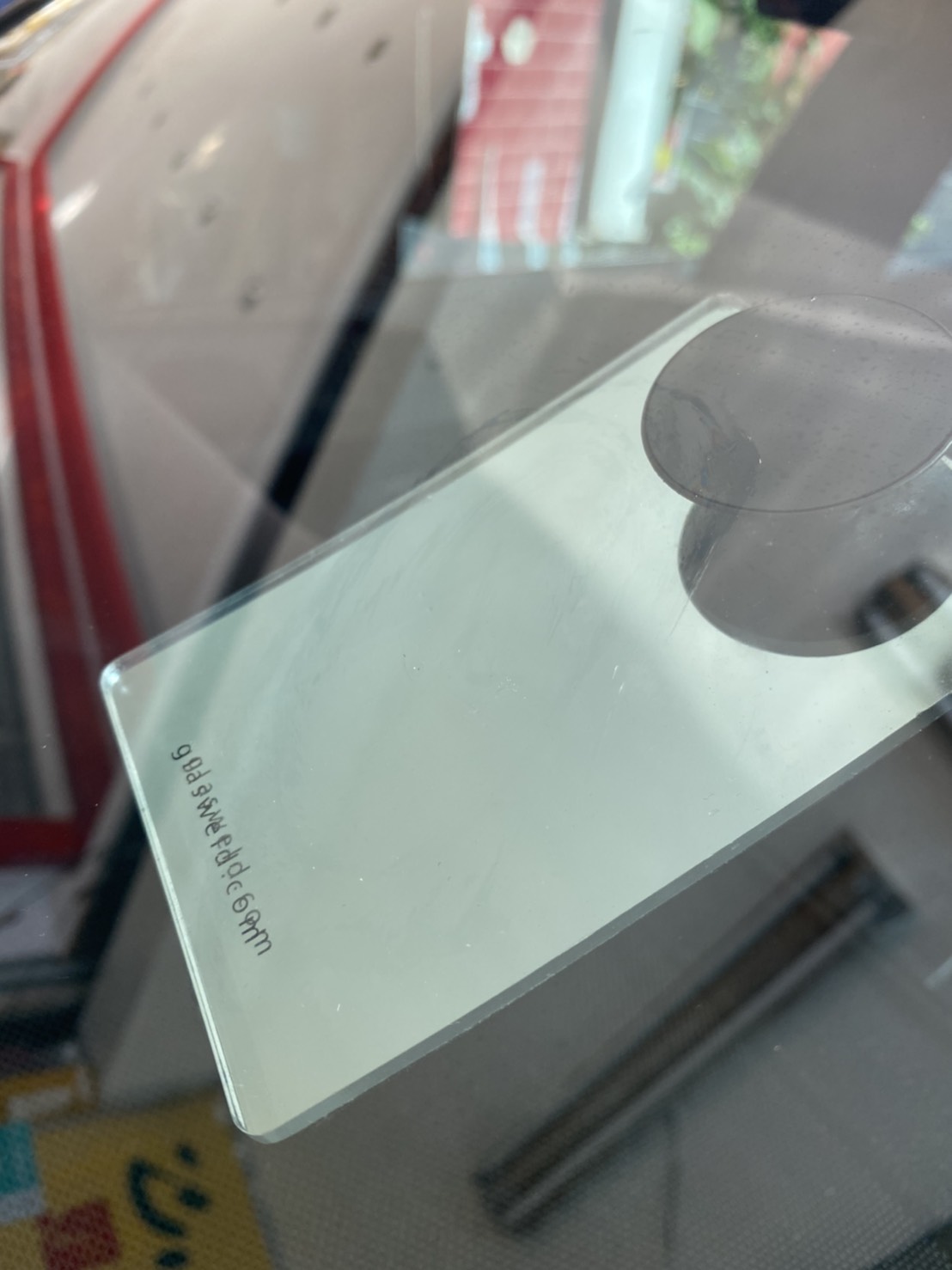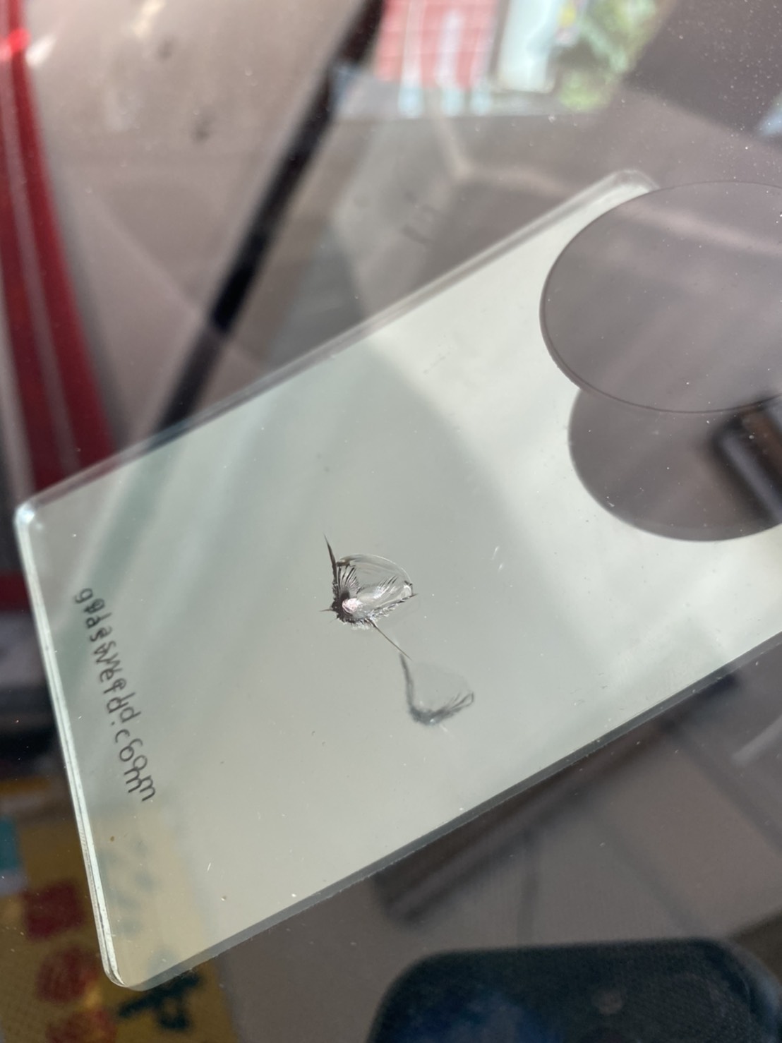 | 四、 貼透明膠帶時間過長才修補,導致膠帶因太陽長時間照射後將玻璃碎屑一同拔起 |